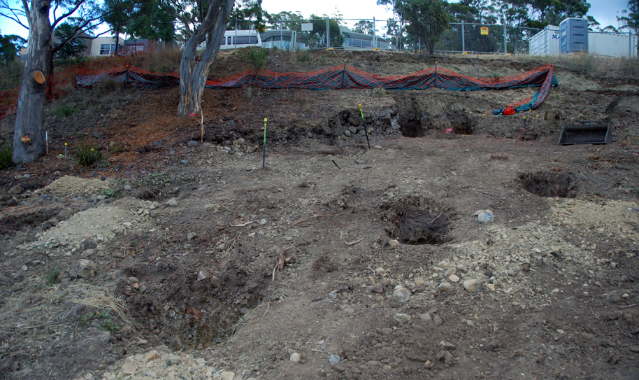 Pier holes for the steel poles. The large holes at the rear with the large bucket to the right of them will be filled with concrete to help retain the soil above them.