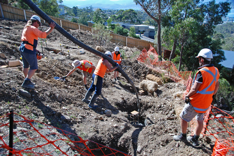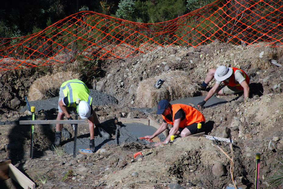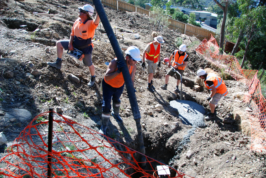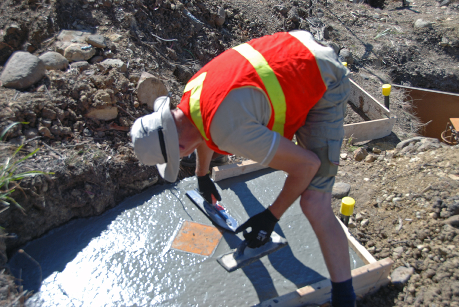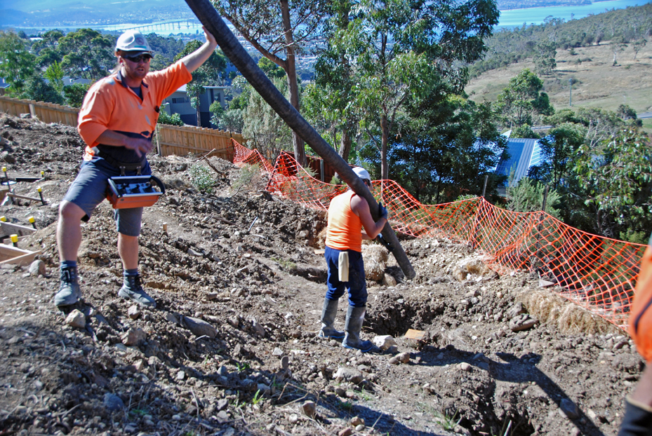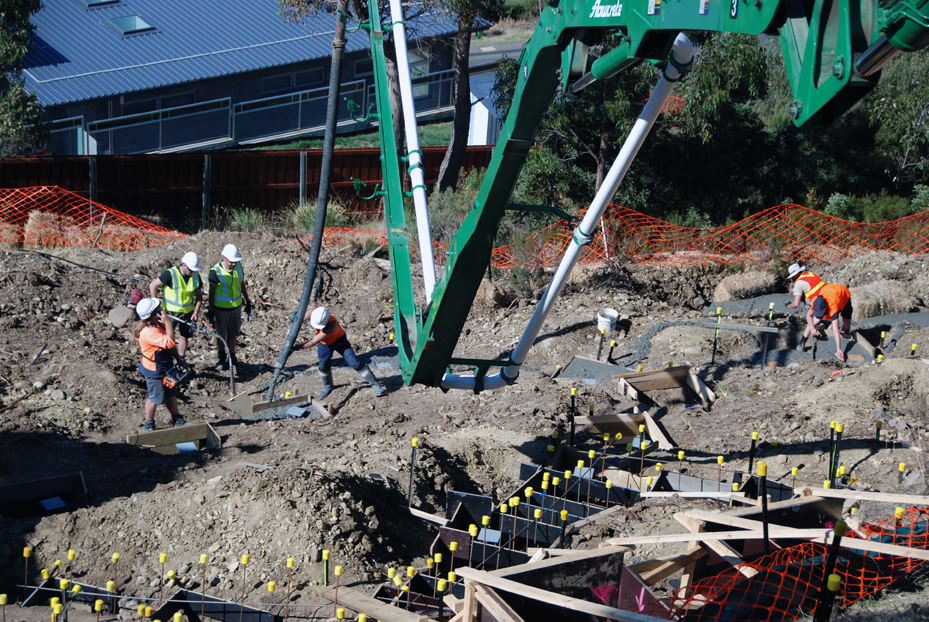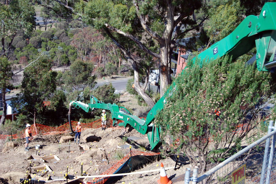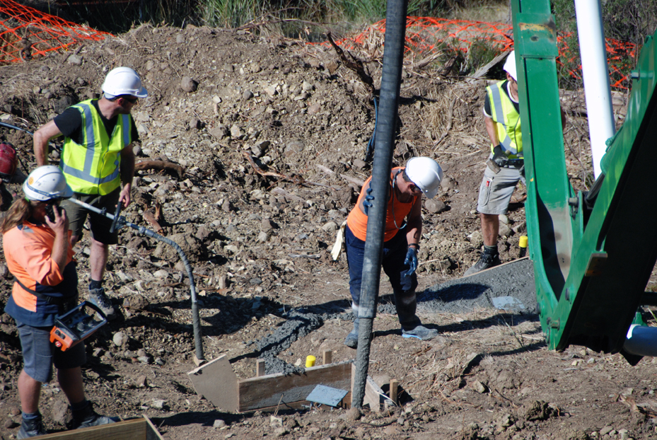 Bert, Elise, Damien and Ian are ready to do the finishing as the pier holes and the strip footings are filled with what we learn afterward is some 37 cubic metres of concrete, about double what the original plan had been before bad soil and hundreds of dolerite ‘floaters’ forced a change to the intended methods.