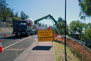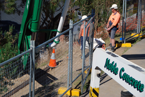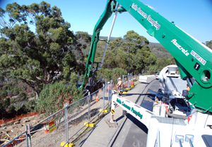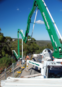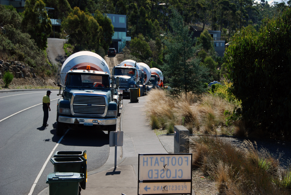 By early afternoon the traffic management crew are in place, the huge pump truck with a very long concrete placing boom has arrived, outriggers are set up, and the boom slowly unfolds as 7 concrete trucks are marshalled down the road.
