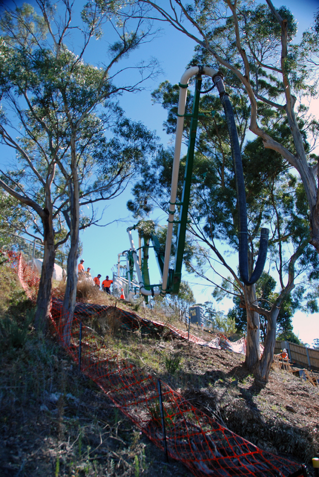 The boom has to be retracted and placed again on the other side of the gum trees so it can reach the majority of the site