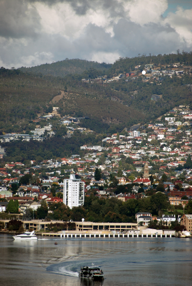 The ferry to MONA, the Museum of Old and New Art, heads up river to Berriedale. The suburb of Battery Point hugs  the shore with Sandy Bay, Dynnyrne and finally Tolmans Hill below the ridge line.