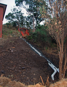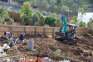 The blocklayers waste no time in getting organised. Meanwhile Jarrod digs the trenches for the stormwater and sewer lines that connect into the sewer and stormwater mains at the south-east corner of the site.