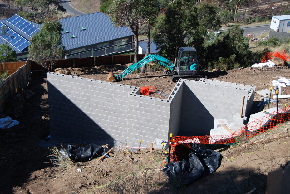 Finishing off the block walls. The stormwater and sewerage pipes are laid on top of ‘blue metal’, one of those odd terms that actually just means ‘crushed rock’. Soon Jarrod the excavator operator will cover the pipes with soil.