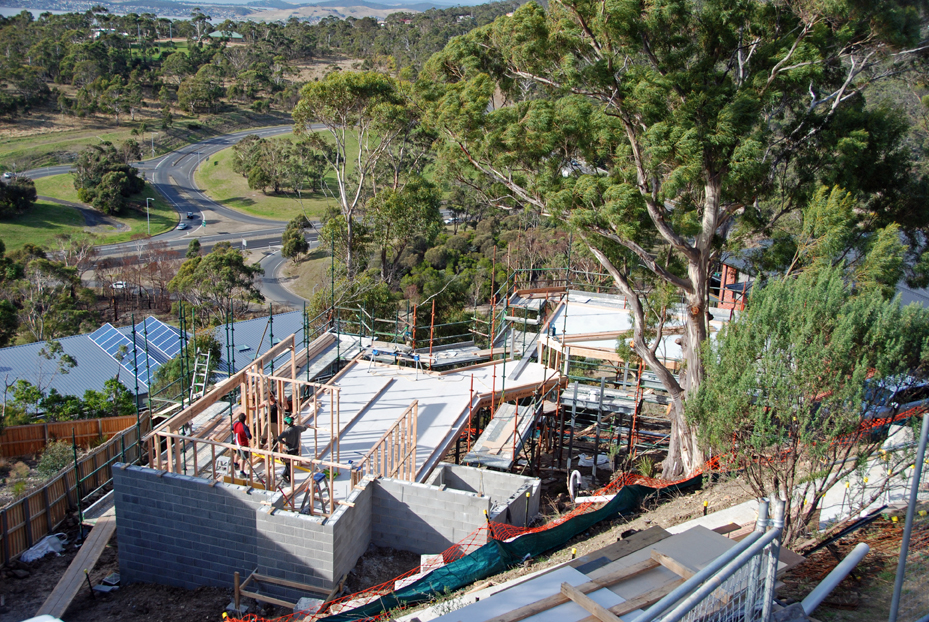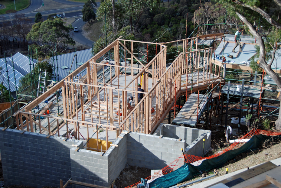 Ian, our builder, has decided to use LVL timber for the wall frames too. It comes in on price midway between the two traditional wall framing materials: standard plantation pine and plantation hardwood. The team of Damien, Jib and Nathan have never used LVL for this purpose before but they say they’re loving it for its light weight, super strength and almost complete lack of warping and twisting so common in traditional materials. The only downside? extra splinters that end up in fingers and hands compared to what typically happens with pine.