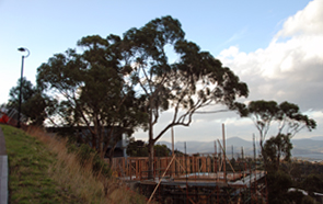 After erecting the rear wall frame, it’s become clear that a major tree branch, of the Eucalyptus viminalis, that would hopefully have been well above the roof is in the way. How much? It’s too low by just a few inches. The options?