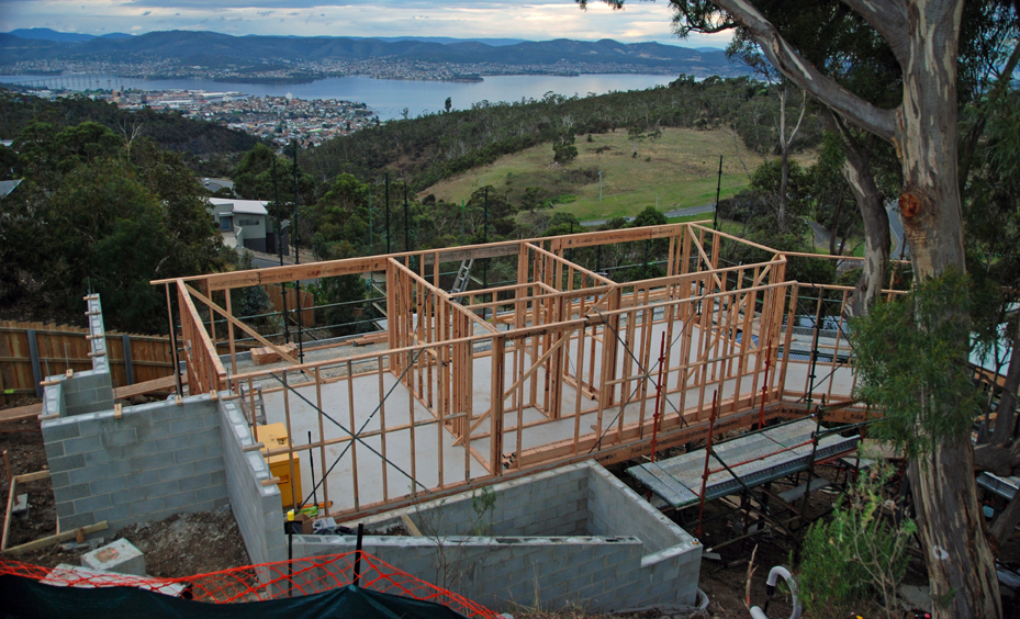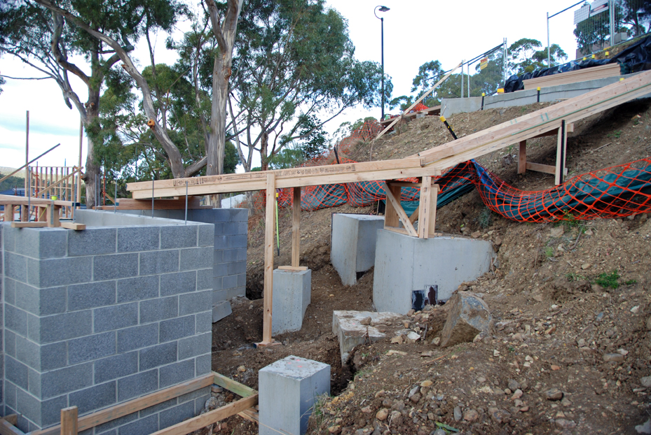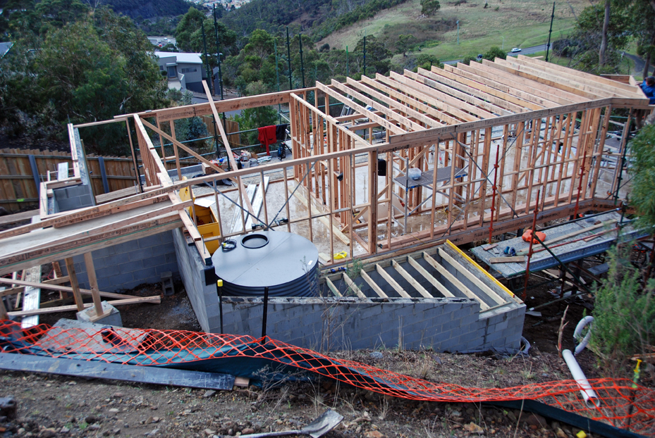 Preparations begin on Day 53 (19 May) to kill a couple of birds with one stone. Access to the emerging house from the street has occurred from ramps laid mostly on the ground. With the lower level’s timber wall frame almost completed, it’s time to create new, easy access from the street – a bridge – to efficiently construct the upper floor. And the rainwater tank is to be delivered on Friday and since it will sit underneath the house’s upper level, the preparations to the ground it will sit on need doing now, too.