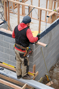 Nathan prepares the timber ‘bottom plates’ on which the upper-level floor joists will sit on the block walls at the front of the house.