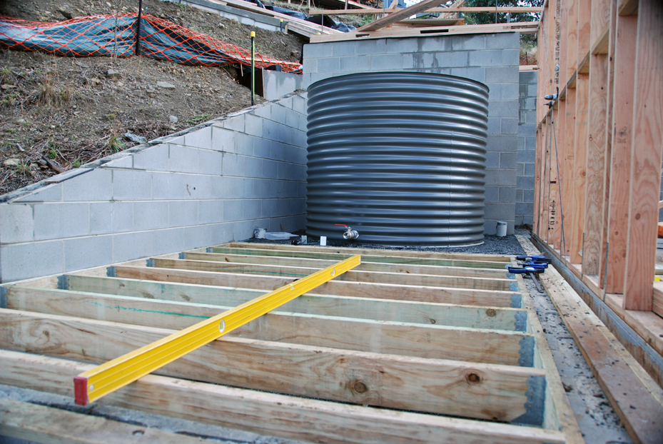 The rainwater will be used for the washing machine, toilet flushing and watering the native flora. For budget reasons, the decision was taken before the build started to cut back from 2 rainwater tanks, capturing all the runoff from the different roof planes, to just this tank, which will capture most of the runoff from two roofs but not from the third, the art studio roof.