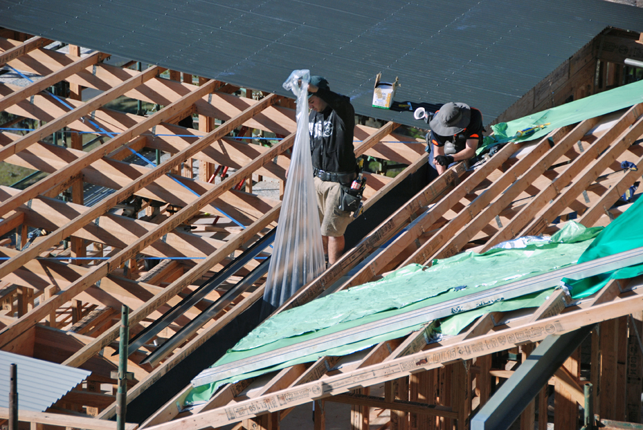 True to the plan, the three roofs and the box gutter are easily completed by the end of Day 94. For those readers who have had trouble envisioning this butterfly roof, getting the sheets on should help.