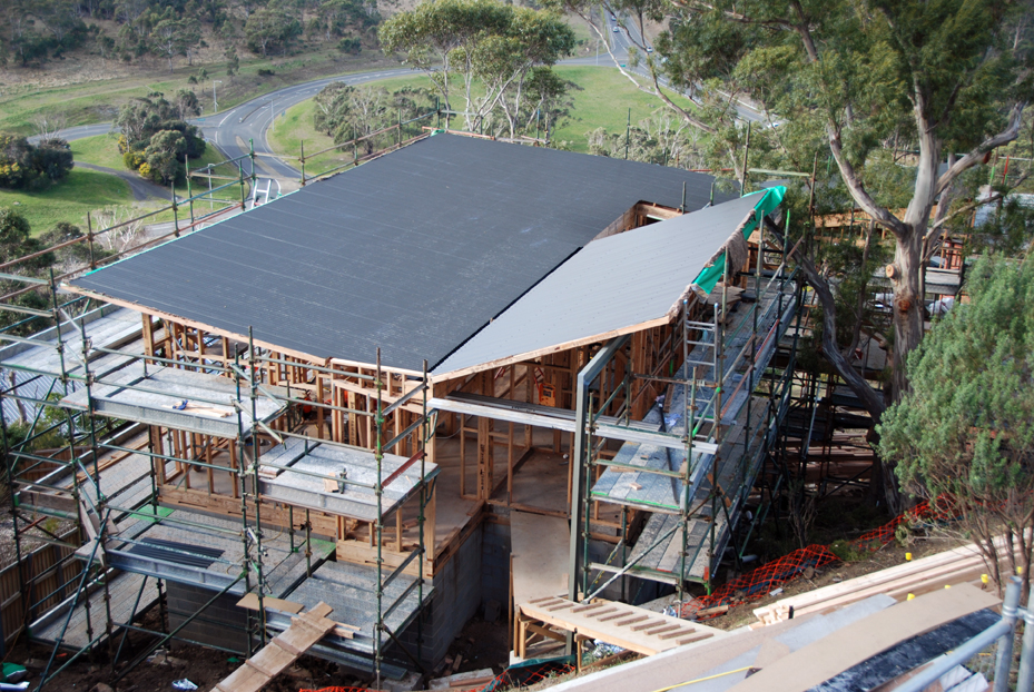 Short of hiring a helicopter or a light plane, photographing all three roof planes together to show how they intersect proves to be almost impossible. Above, the art studio roof, which falls in the same direction as the solar PV-ready roof on the right, can just be seen in the distance. Site foreman Nathan stands on it while contemplating his next moves. Your blogger’s next move is to post again soon.